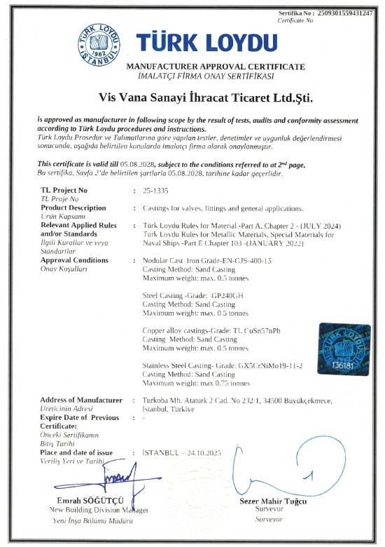 Türk Loydu Factory Certificate (Material: Ductile Iron / Steel / Stainless Steel / Bronze)