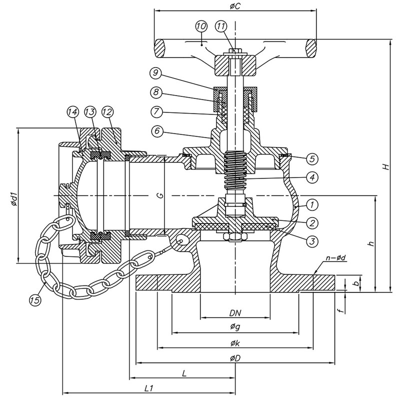 | DN | Size | L | L1 | h | H (C/O) | G | d1 | C | ØD | ØK | Øg | b | f | n - Ød | kg |